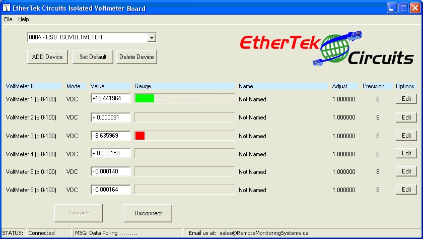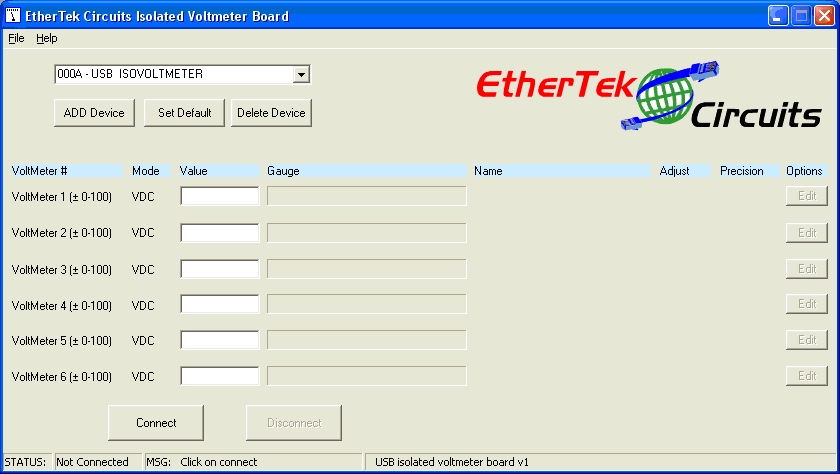 The program will connect to the USB isolated Voltmeter board selected and display the